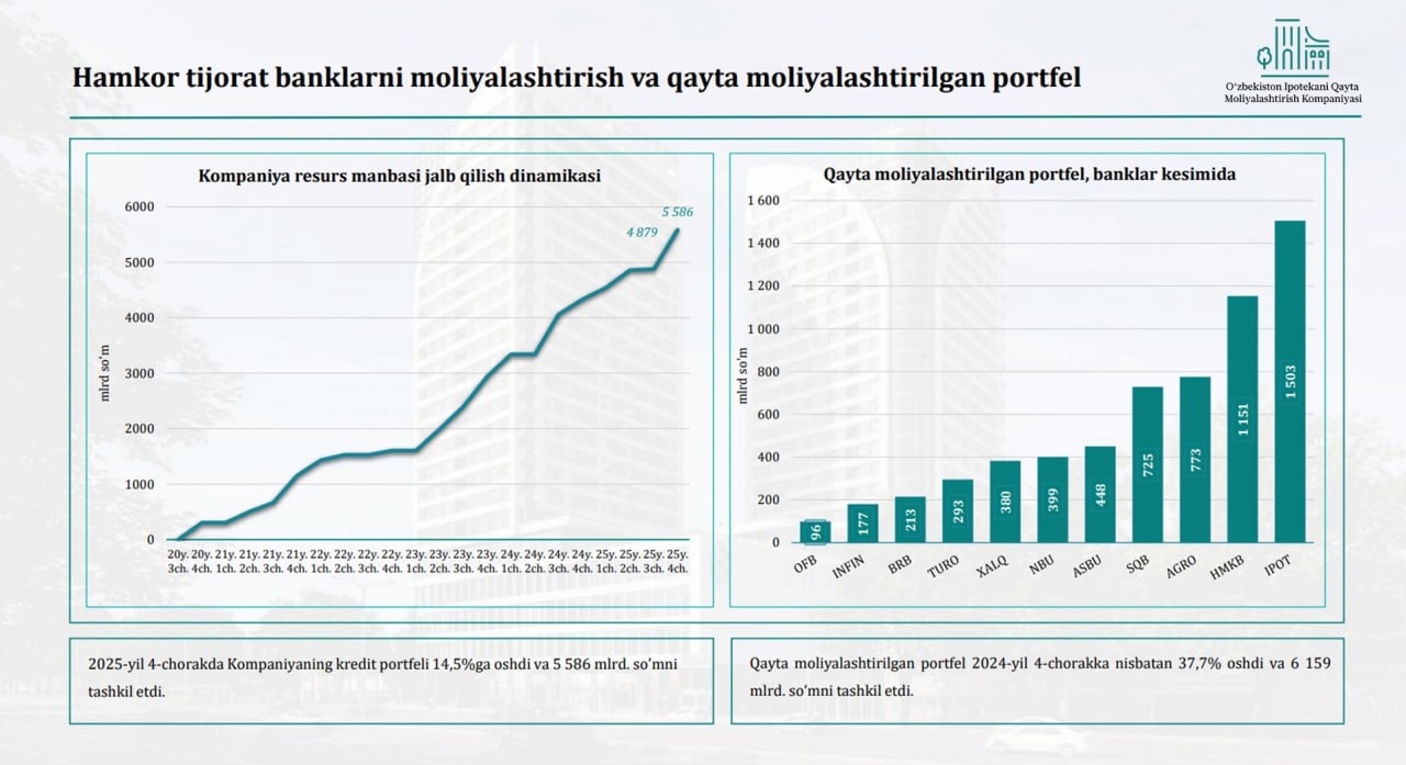 Bu ko‘rsatkichlar banklar bilan o‘zaro hamkorlik ko‘lami kengayib borayotganini hamda ipoteka bozorida ijobiy faollik kuzatilayotganini ko‘rsatadi.