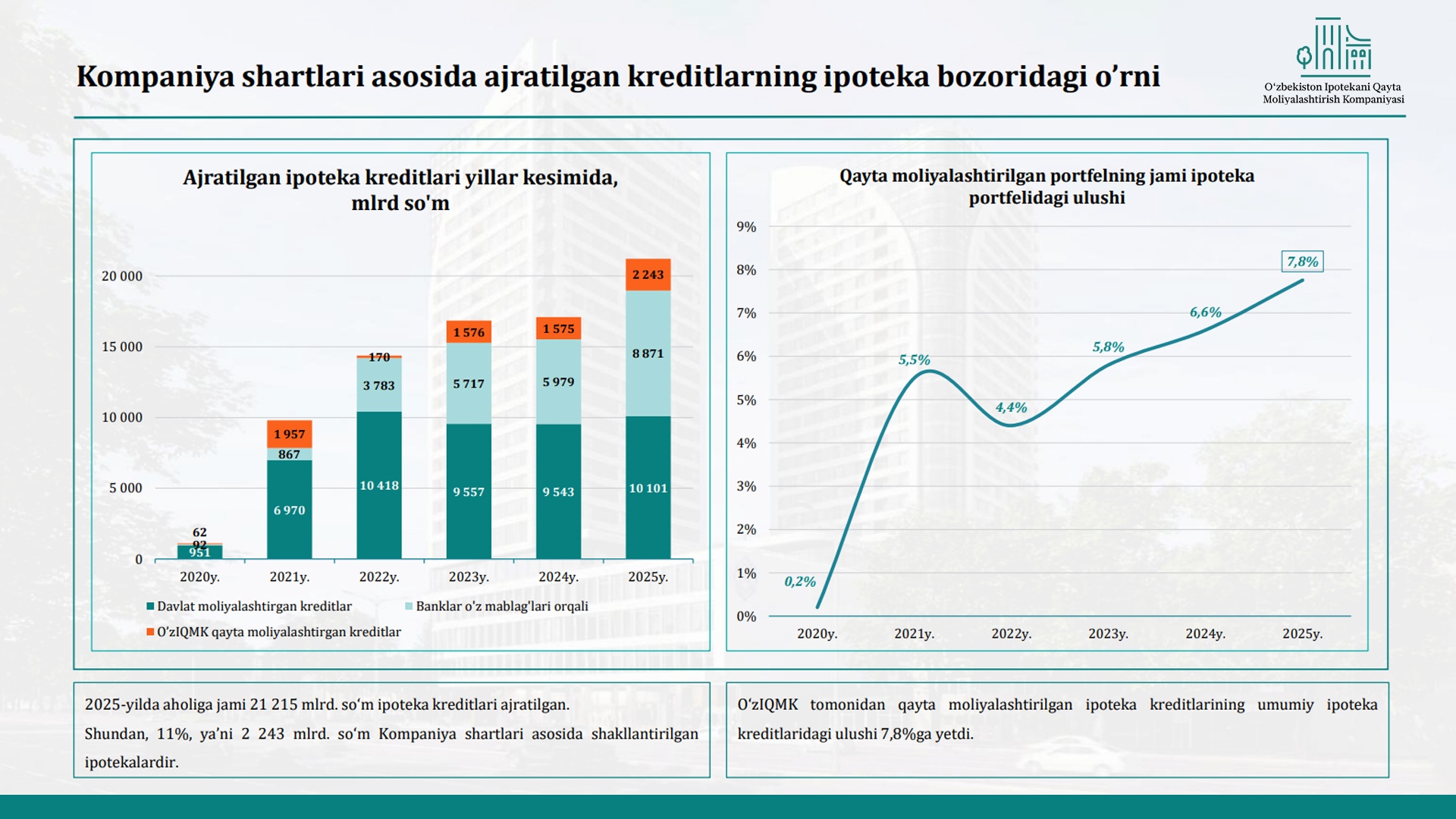 2020–2025 yillar davomida ipoteka bozori barqaror o‘sishni namoyon etdi. Ayniqsa, Kompaniya shartlari asosida shakllantirilgan kreditlar ulushi yildan-yilga ortib bormoqda.